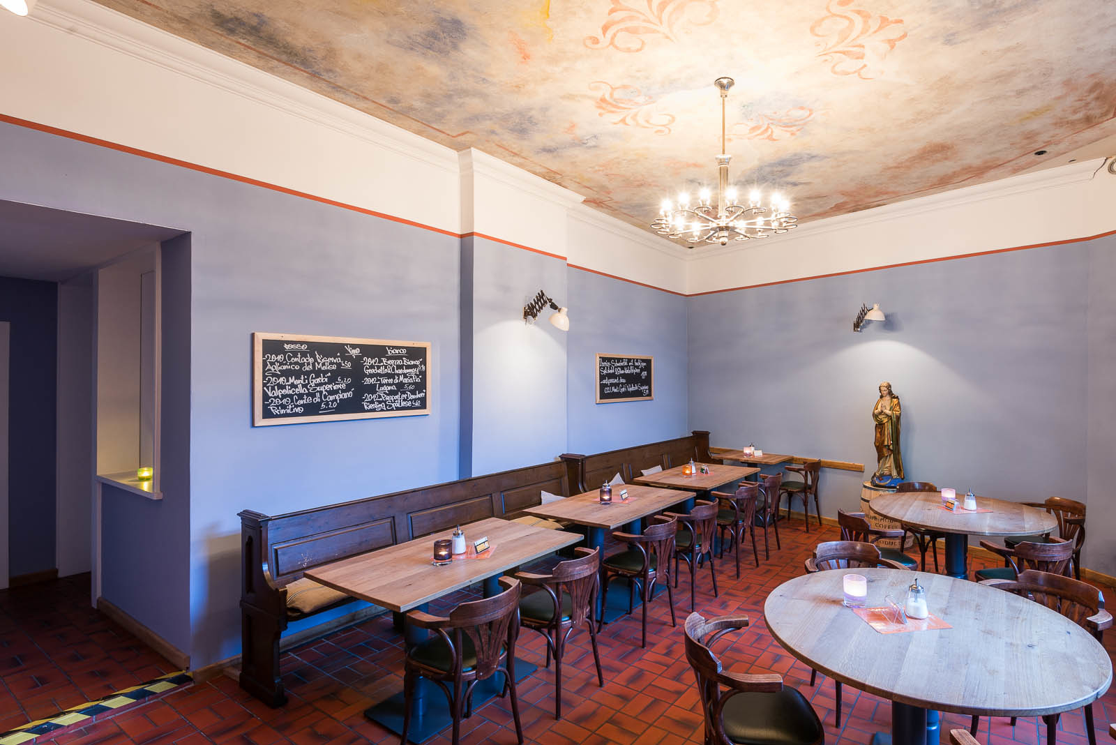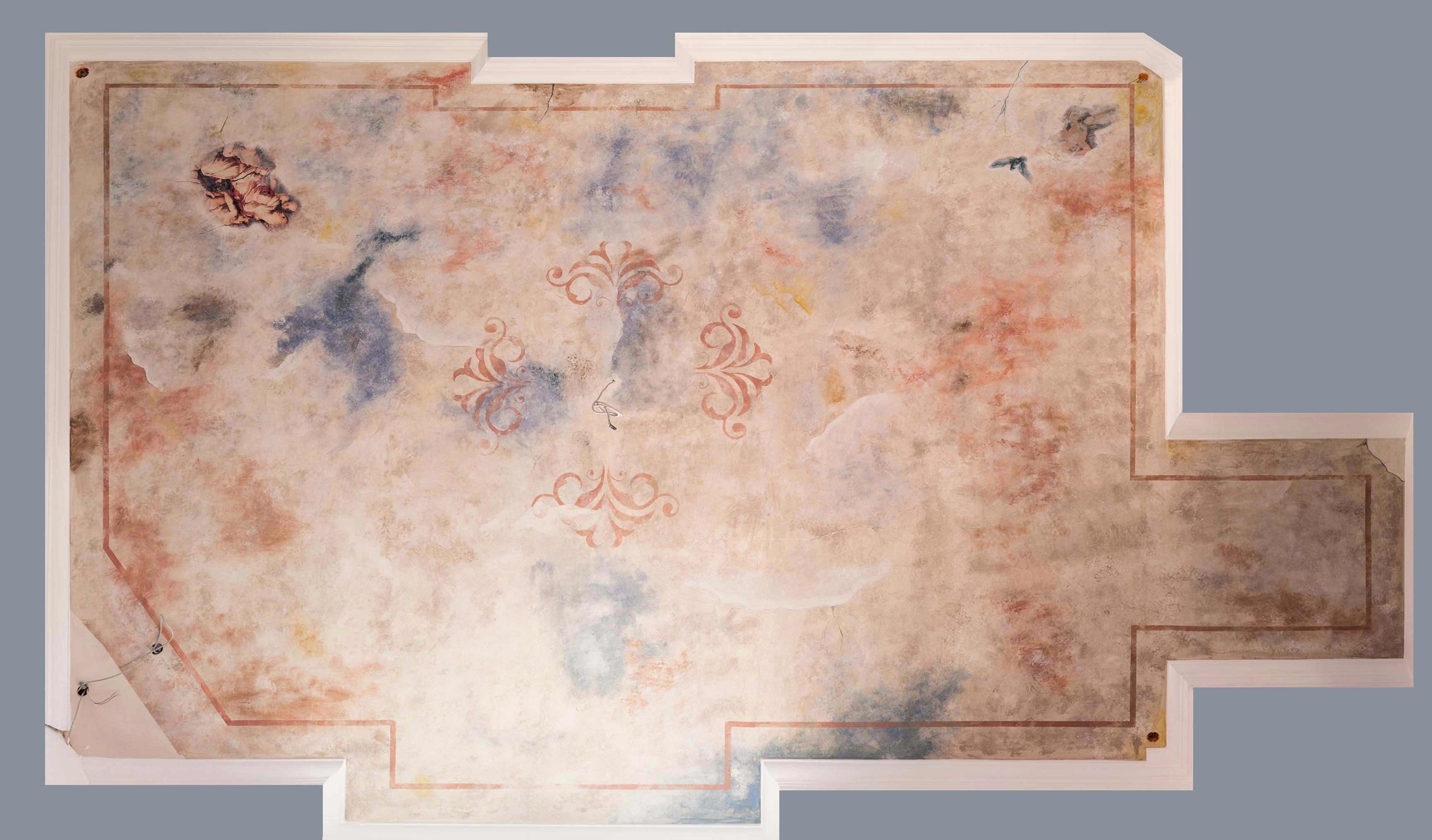 Dabei ist jeder Fleck und jeder Riss von Beginn an fest eingeplant gewesen, den smart art erstellte nach einer Kundenidee das Konzept zur Deckenmalerei. Es sollte die Illusion geschaffen werden, dass auf dem freigelegten Deckenputz alte Malereien wiederentdeckt wurden und verschiedene Engelmotive und Symbole diese Decke seit Jahrhunderten verschönerten und nun erst wieder zum Vorschein kamen.