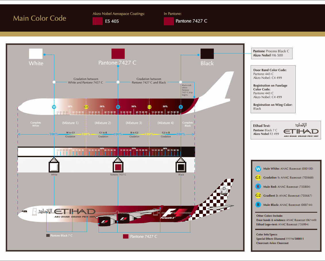 Gerade bei Flugzeuglackierungen sind Verlaufslackierungen DER Hingucker schlechthin. 2009 erstellte smart art für die Fluglinie Ethiad die größte Verlaufslackierung der Aviation in gewohnter Perfektion. Im Zuge des Formel1 Abu Dhabi Grandprix 2009 designte smart art eine aufsehenerregende Flugzeuglackierung in schwarz/rot/weiß.