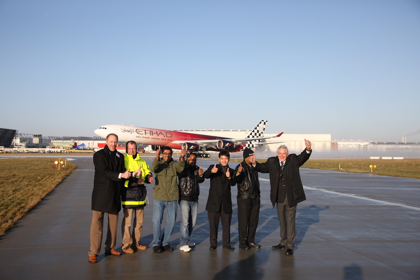Die Lackierung startet am Seitenleitwerk des Ethiad-Fliegers mir dem schwarz/weißen Karomuster der Zielflagge, eine vollflächige Verlaufslackierung von Schwarz zu Rot erstreckt sich über den Rumpf und endet in strahlendem Weiß am Cockpit. Ein ziemlich beeindruckender Anblick!